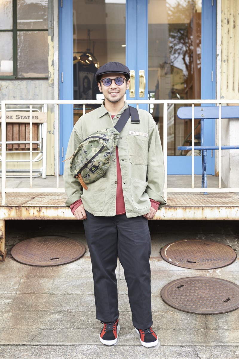 ヴィンテージのミリタリーヘリンボーンジャケットに、オールドステューシーやエアウォークなどの’90sアイテムを組み合わせているのが新鮮。ディッキーズのパンツなど、定番のものをうまくミックスしているのも評価大。
