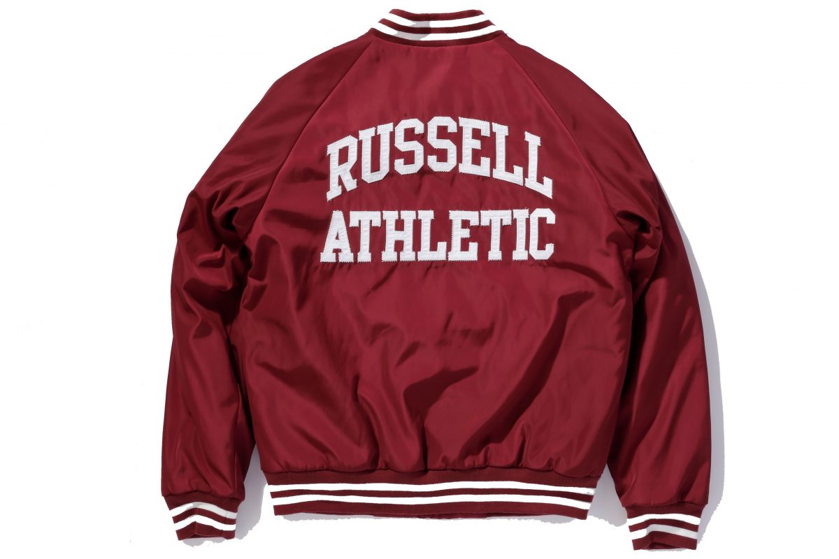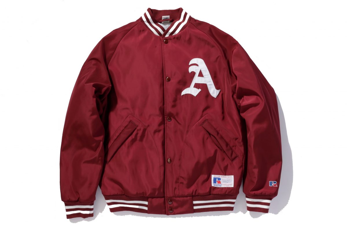 こちらもラッセル・アスレティックのオーソドックスのスポーツスタジャン。胸元と背中にあしらったワッペンが特徴的で、よく見ると昔ながらの縫い付け技法が使われている。それがまた味があって、クラシカルな印象だ。