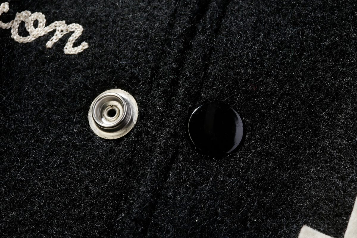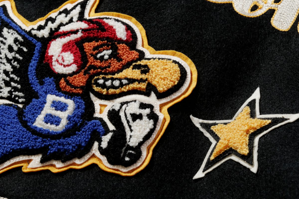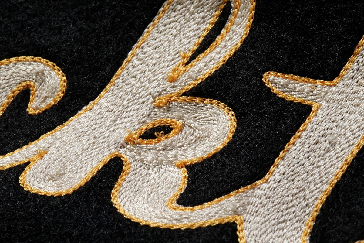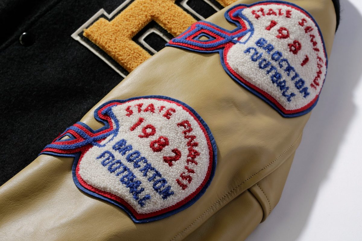 大学名のイニシャルなどを大型のブロック体で表現するのがスタジャンの最もポピュラーな装飾ひとつ。このブロック体の中にさらにスポーツ競技のモチーフを刺繍することも多い。