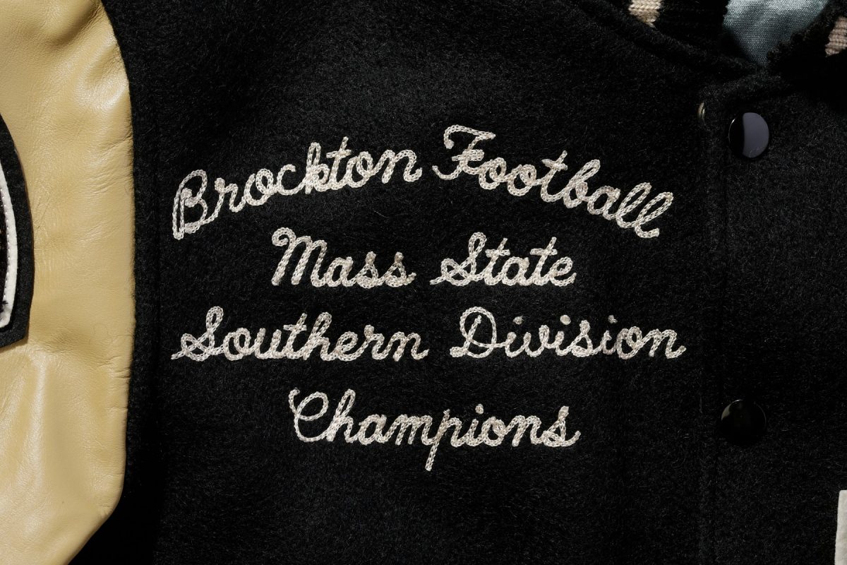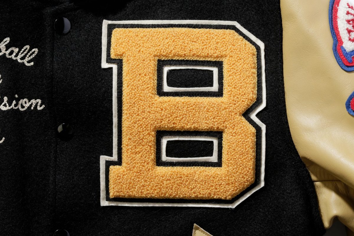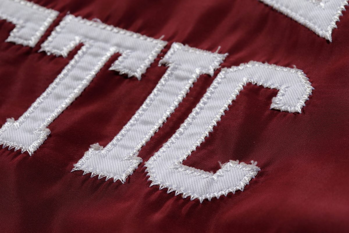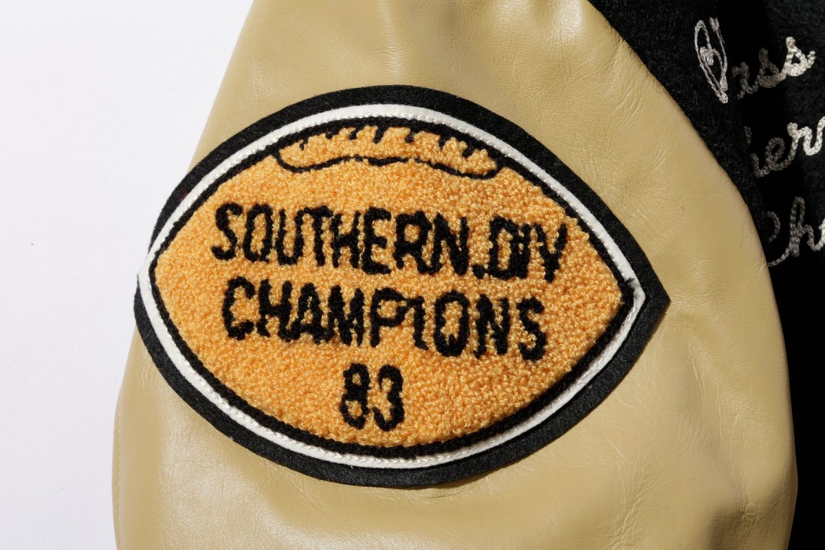 大学名のイニシャルなどを大型のブロック体で表現するのがスタジャンの最もポピュラーな装飾ひとつ。このブロック体の中にさらにスポーツ競技のモチーフを刺繍することも多い。