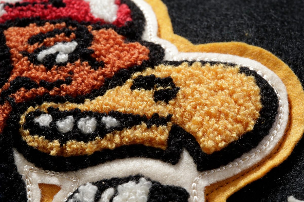 モチーフのキャラクターやバック(背面)にデコレーションされた文字は、チェーンステッチで表現されることが多い。凹凸がありながら光沢糸を使った刺繍は華やかに見える。