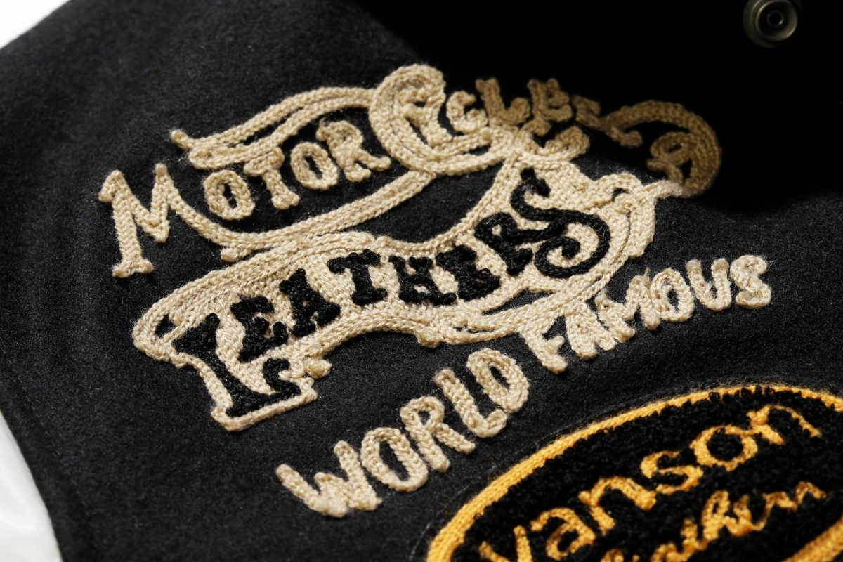 ブラックのメルトンウールにクリーム色のカウハイドの袖、旧きよきスタジャンの魅力を存分に味わえるコンビネーションに、盛りだくさんのシニールで味付けした絢爛豪華な1 着。背面にはボリューム感満点のサガラ刺繍によるデコレーションが入る。