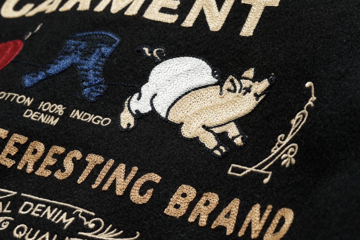 背中にはダルチザンのキャラクターとしてお馴染みのブタさんも、チェーンステッチによって描かれている。立体感のある刺繍の凹凸は熟練職人の手仕事がなせるわざだ。