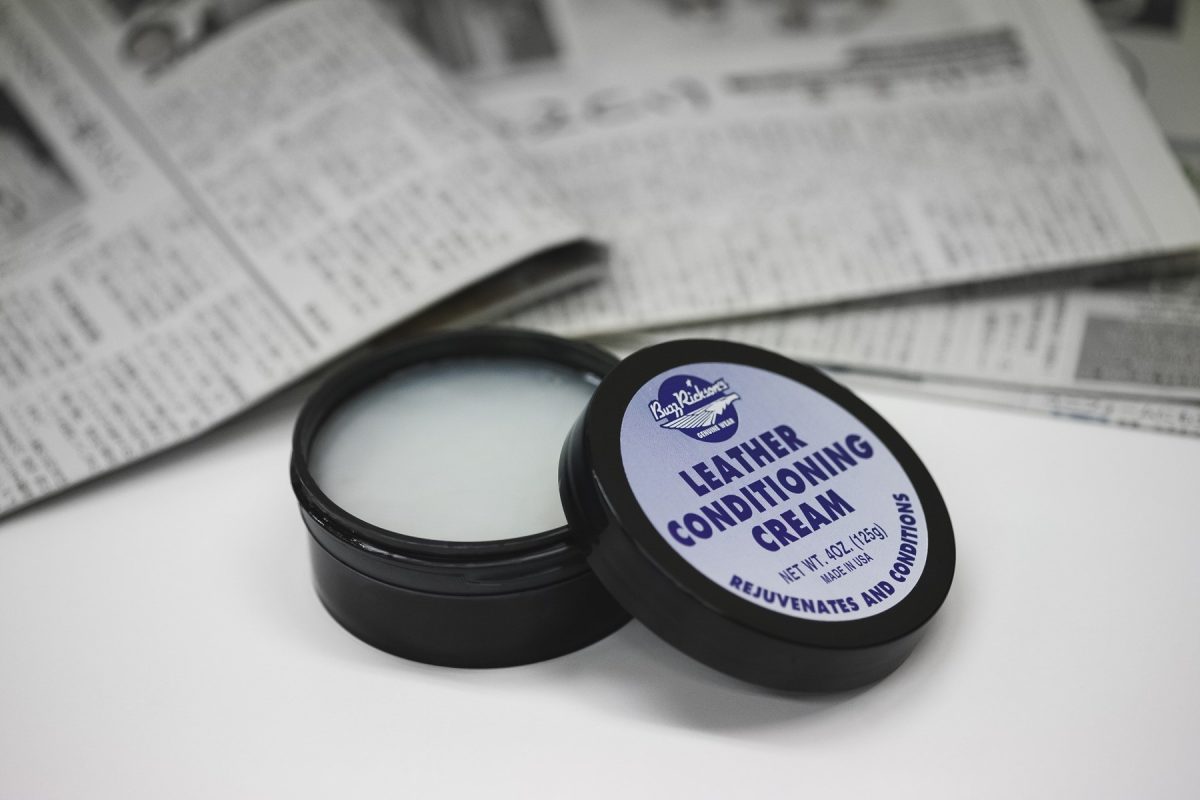 こちらはワセリンと鉱油をベースとしたバズリクソンズのレザーコンディショニングクリーム。ミンクオイルと比べると抜群の浸透性を誇る。革の状態にもよるが、塗布は年に1、2回で十分。