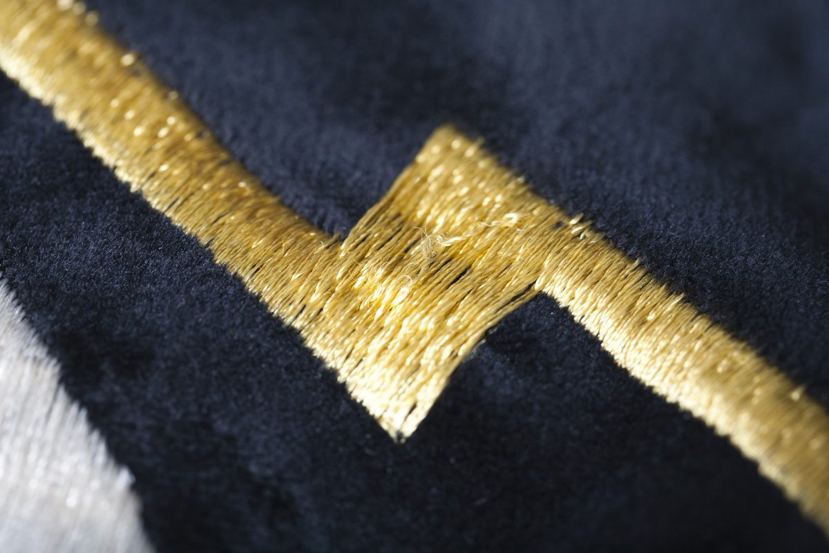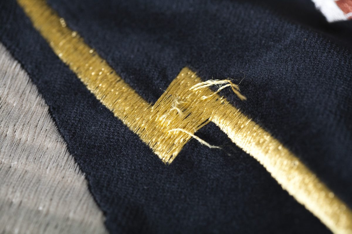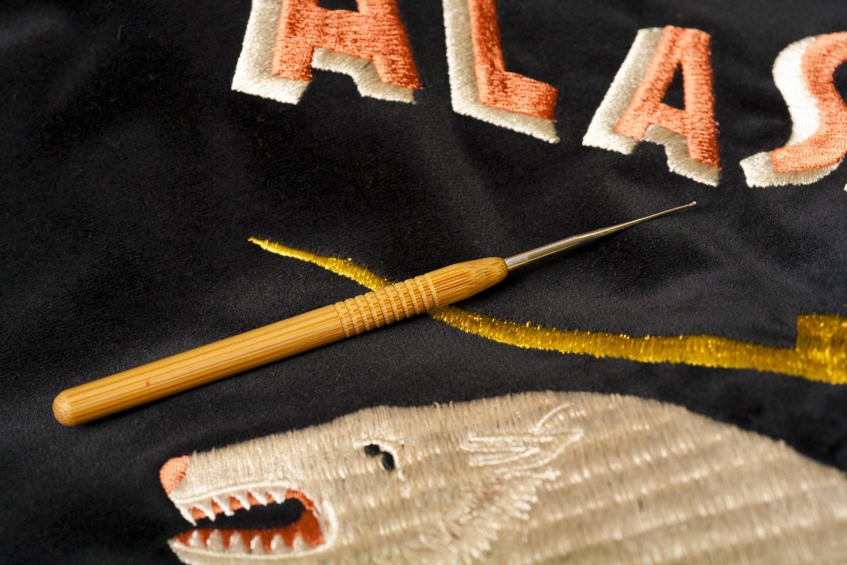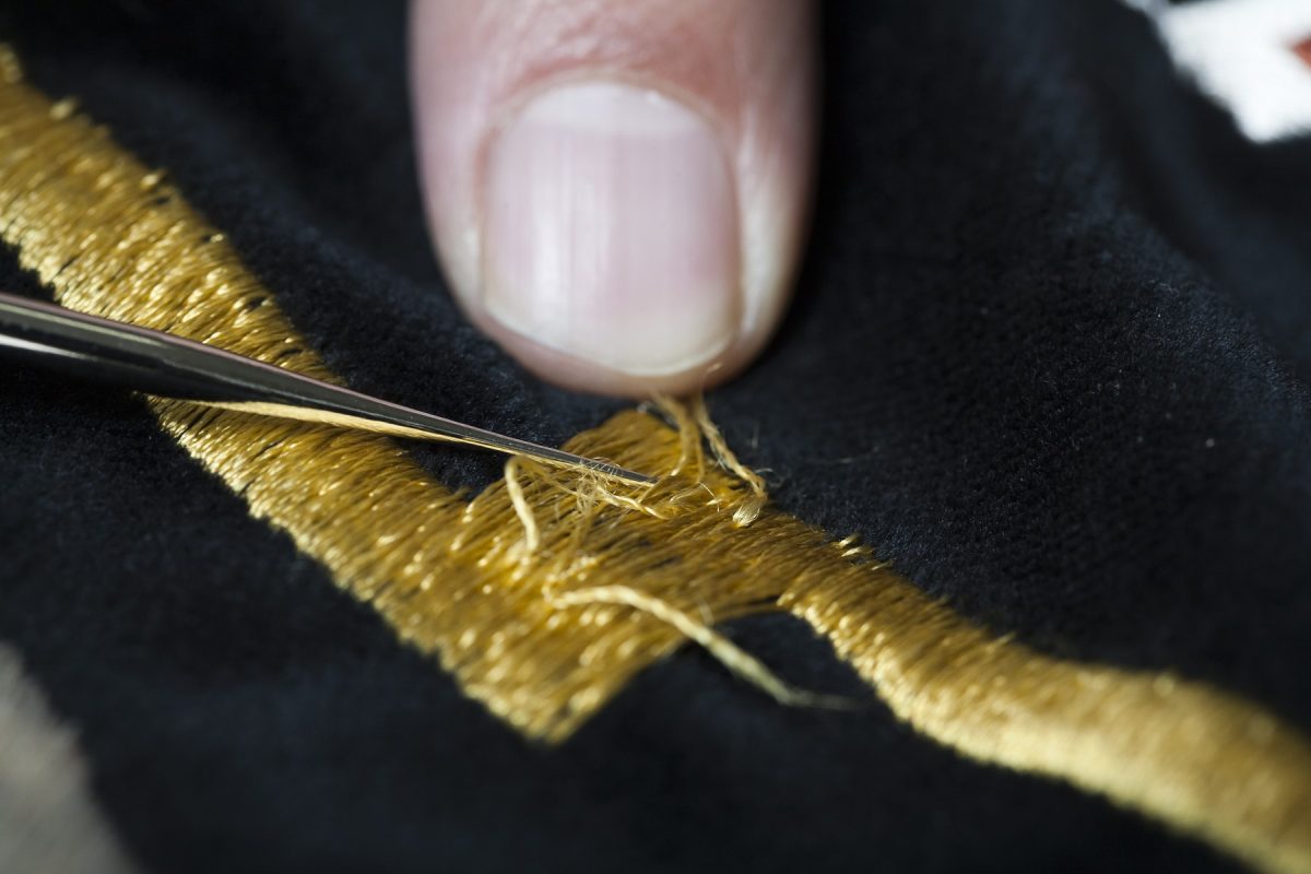 スーベニアジャケットの刺繍は非常にデリケート。糸が飛び出してしまった場合、切るのは絶対にNG。レース針で押し込むのが正しい対処法だ。
