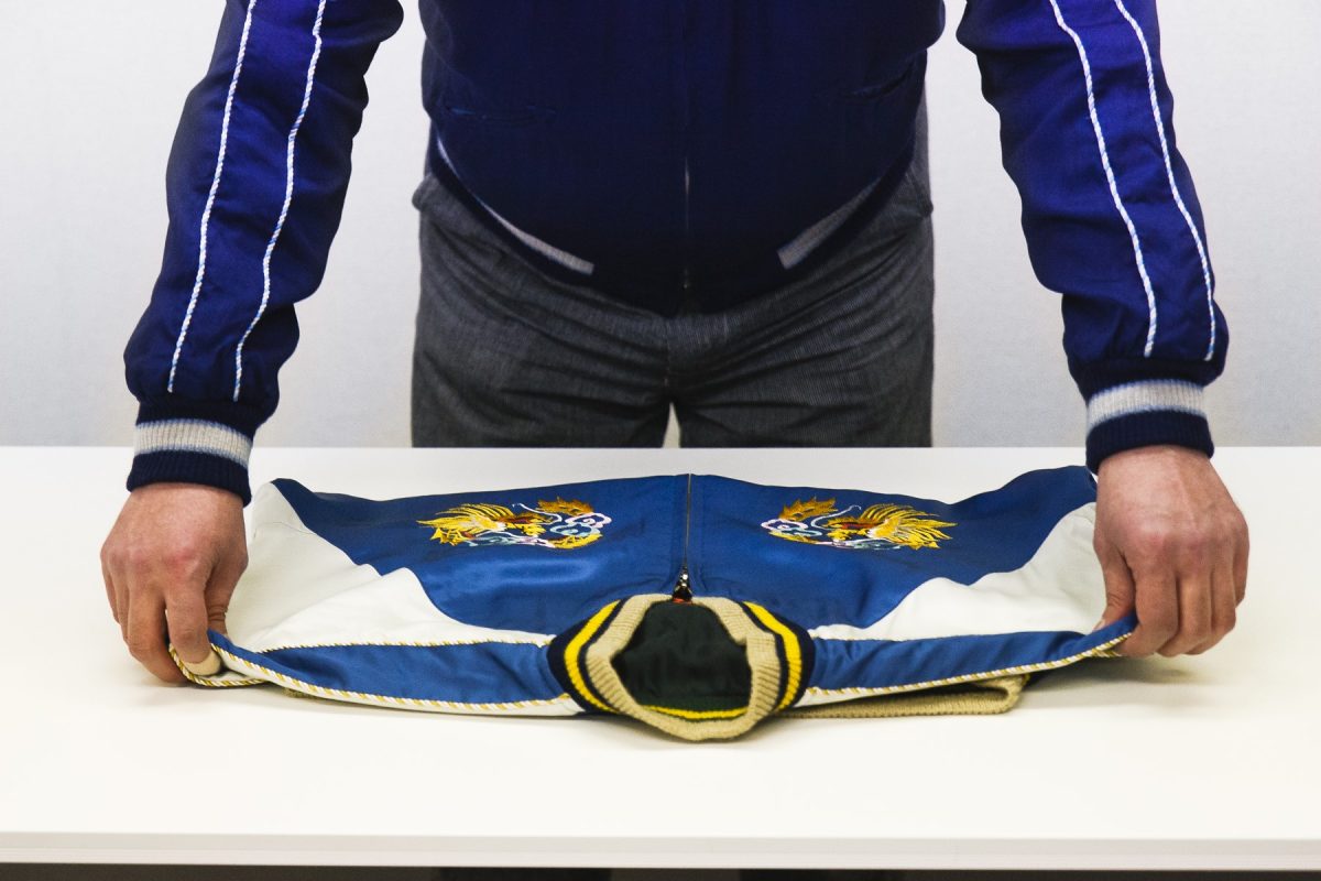 スカジャンは、アセテートや別珍など、デリケートな生地を使っているので、肩に負荷の掛かるハンガーでの長期保管は避けたい。そのため、たたんでストックしておくことが基本。