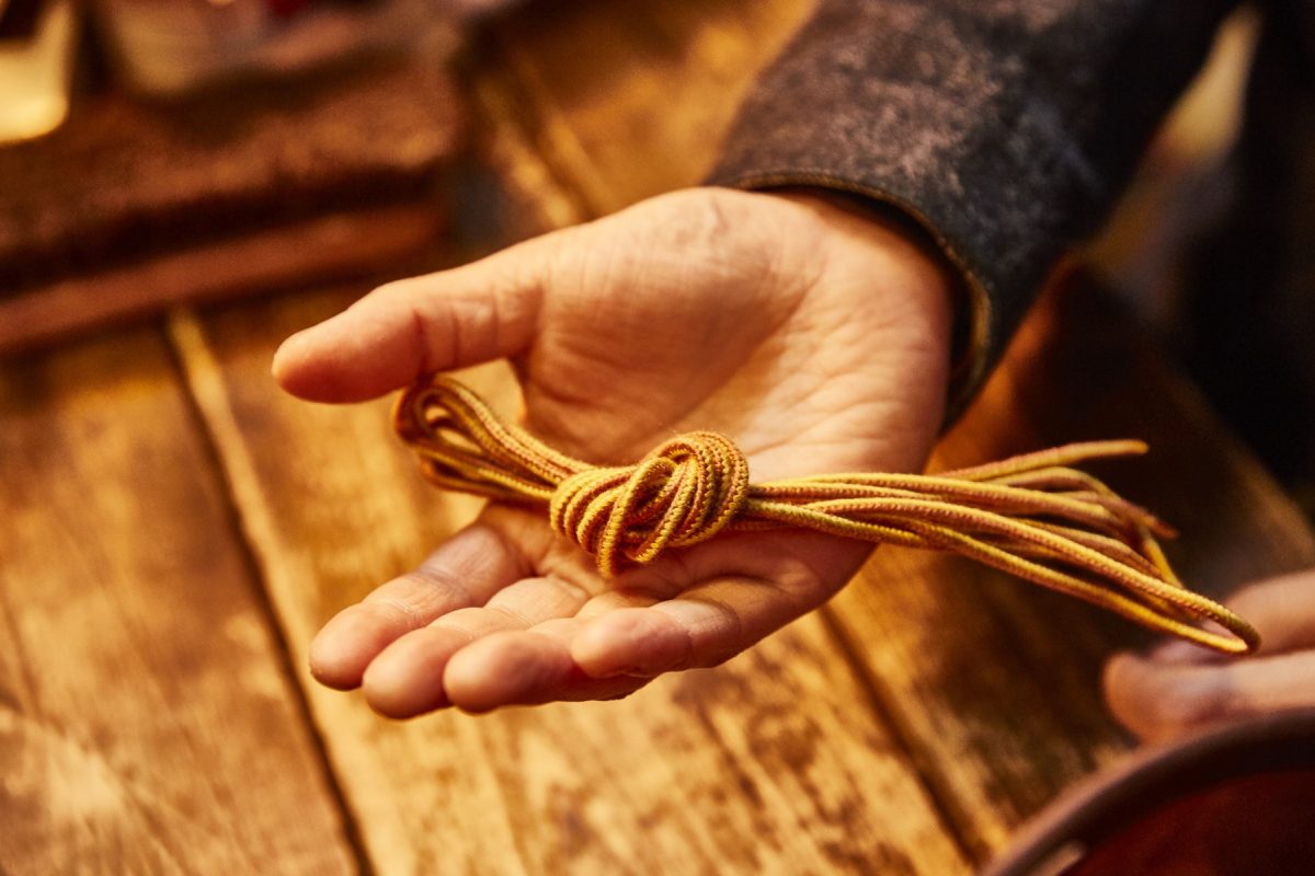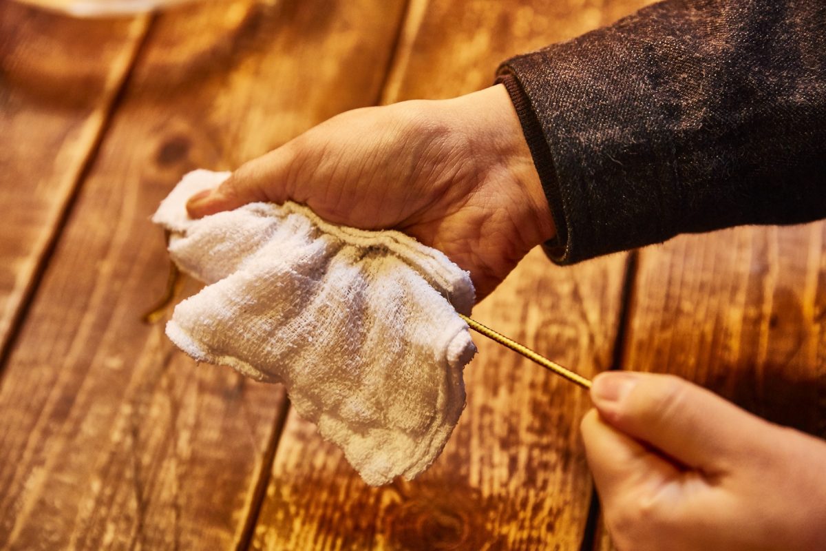 濡れたタオルで紐を挟んで、引っ張るように伸ばしながら紐の汚れを拭き取っていく。