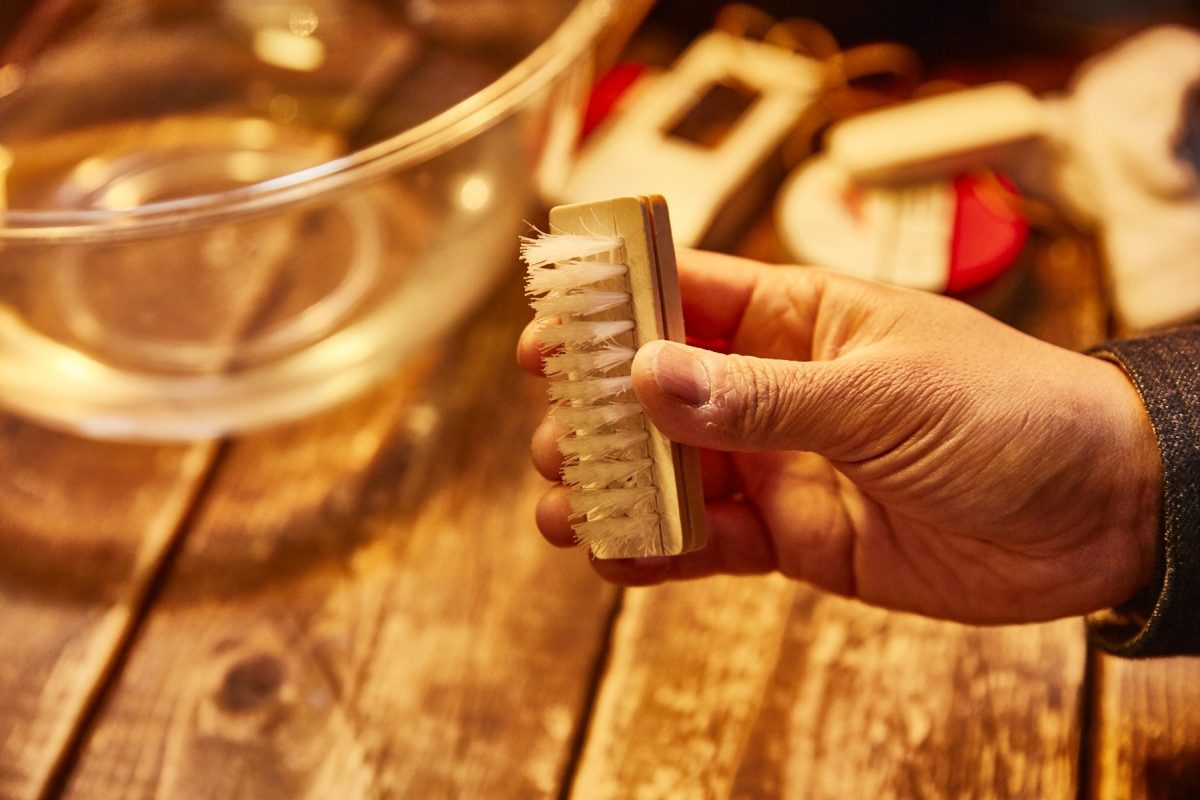 ラフアウトのメンテの主役はナイロンブラシ。馬毛ブラシよりもコシがあるのが特徴的。