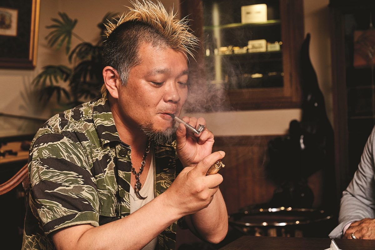 完成したオリジナルパイプの出来栄えを確かめながら、紫煙を燻らす三井さん。「この重みとサイズ感がいいね。ボウルは小さいけど、結構吸い応えもあって、満足できるよ。このパイプでシャグを気楽に楽しんでほしいね」