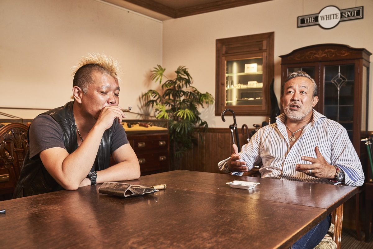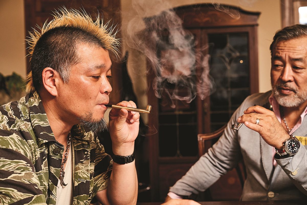 シャグパイプを楽しみながら、喫煙談議に花を咲かせる三井さんとモヒカン小川。「こんなにクールなパイプが出来たなら、今度はレザー製のカッコいいシャグポーチが欲しくなるね。使い込むほどにアジが出る革のポーチ、きっとライトニング読者の方ならハマるはずだよ」と三井さん。