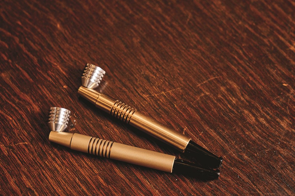 こちらが今回完成した柘製作所×ライトニングのオリジナルシャグパイプ。ブラスト加工を施した真鍮の鈍い輝きがたまらない。ボウルにはアルミを採用し、2トーン仕様に。シャグのパッケージに入る大きさにすることで携帯性を良くし、いつでも使えるような、手軽なパイプを目指した。こうして、従来のパイプのイメージを払拭する、クールなオリジナルパイプが完成したのだ!