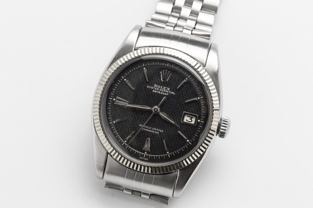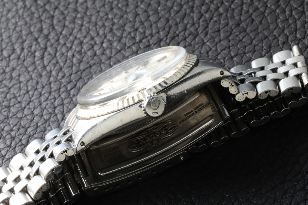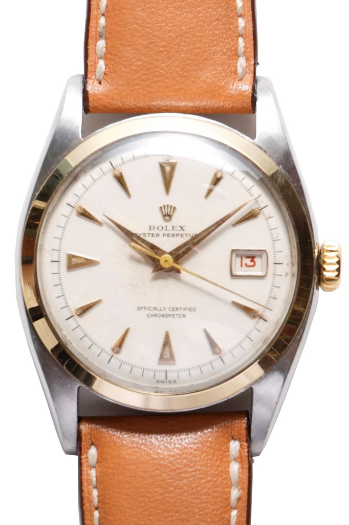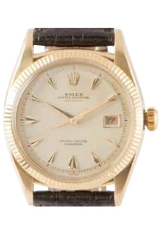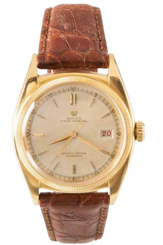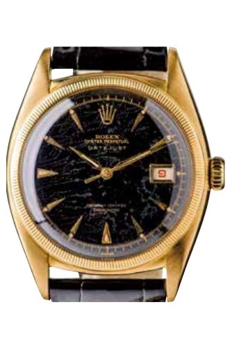バブルバック後期のモデルで、通常の34mm径のオイスターケースではなく、36mm径のものを使ったモデルは、”ビッグバブルバック”と呼ばれているが、実はそれがデイトジャストのルーツ。Cal.A296を搭載しており、文字通りケースはバブルバックになっている。ダイアルはブラックのギョーシェ彫りで、装飾でありながら反射を抑える役目もあった。