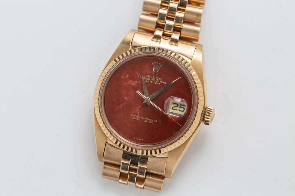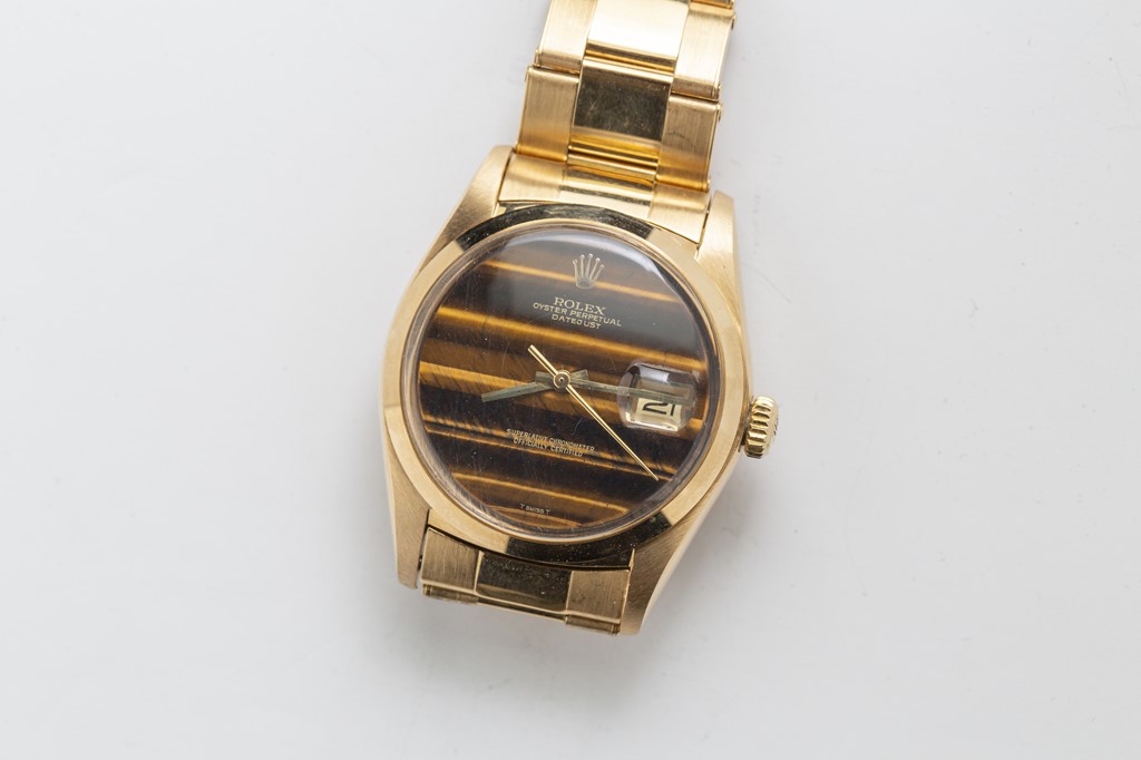 ダイアルにタイガーアイを使った珍しいデイトジャスト。時間を確認するためのものというより、ここまでくると完全にアクセサリーである。