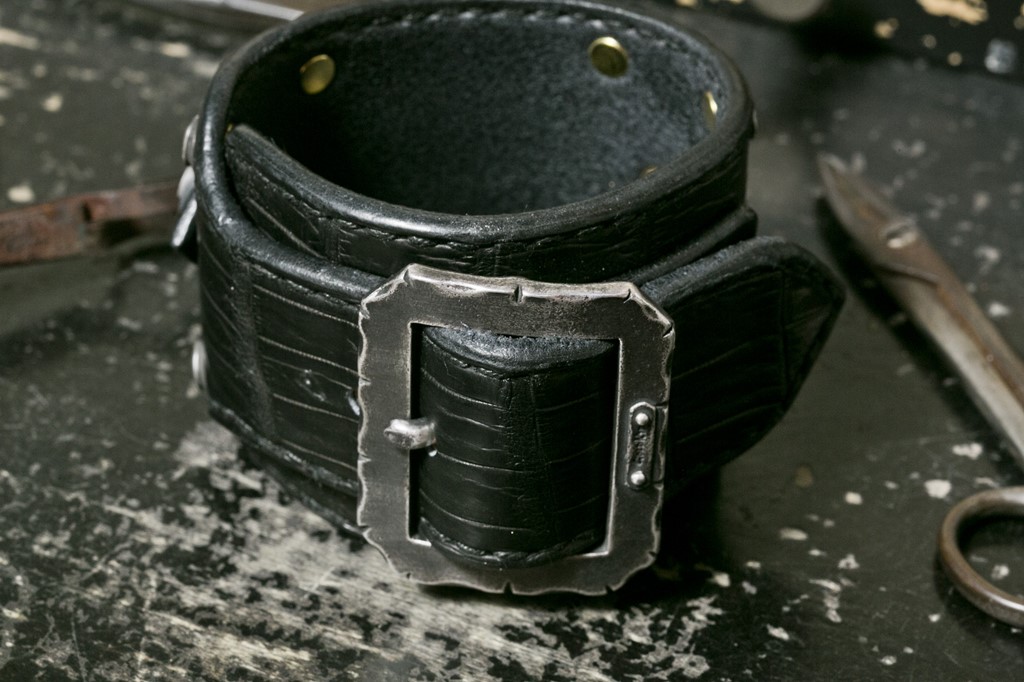 スタッズもオリジナルデザインのシルバーでドレスアップ。使用するクロコダイルレザーも厚手のモノを使うなどボリューム満点の作り。