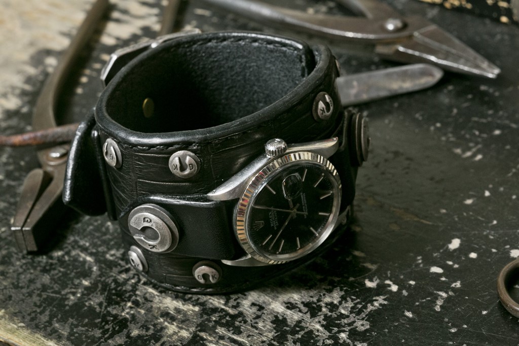 「そのままでもいいですけど、普通じゃつまらないし、他にもブレスやリング、ペンダントなどもつけていいるので他に負けないようにボリュームを出すようなカスタムにしました。シルバーや金属もいいですけどボリュームが出ないから、レザーを使用しました。クロコダイルのフォーマル寄りな雰囲気もありながら、シルバーのスタッズでゴツさを出しています」
