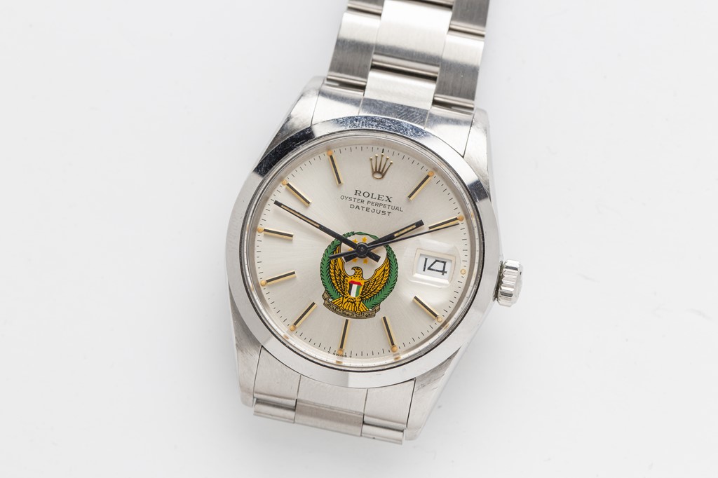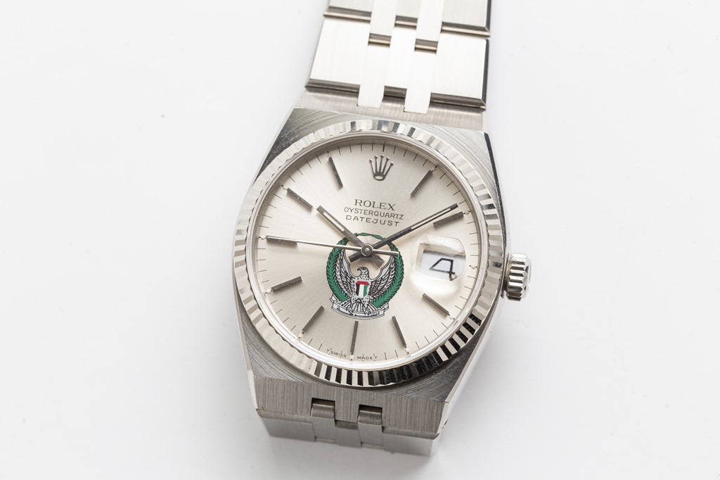 クオーツムーブメントを搭載した珍しいデイトジャストだが、UAEの国章が施された別注モデル。なかなか見かけることのない1本といえるだろう。