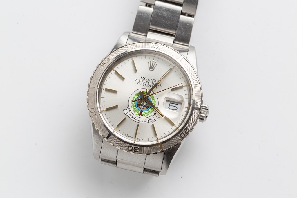 サウジアラビア空軍が別注した1本。サンダーバードと呼ばれる、回転ベゼルを装備したデイトジャストは、パイロットに由来するモデルとして知られている。