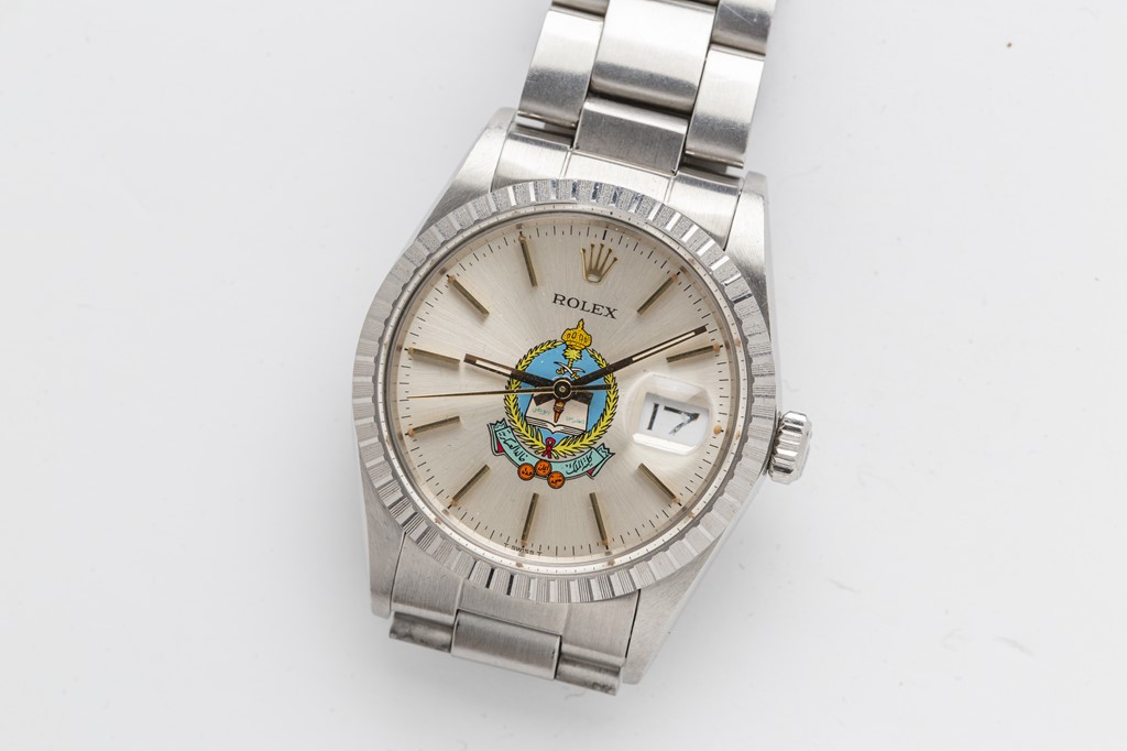 サウジアラビア軍関連の学校別注で作られたと思われるデイトジャスト。紋章を中央に大きくプリントするため、ロレックスの表記以外何も文字が入らないという異色のダイアルだが、この紋章のものは全てこのように施されている。