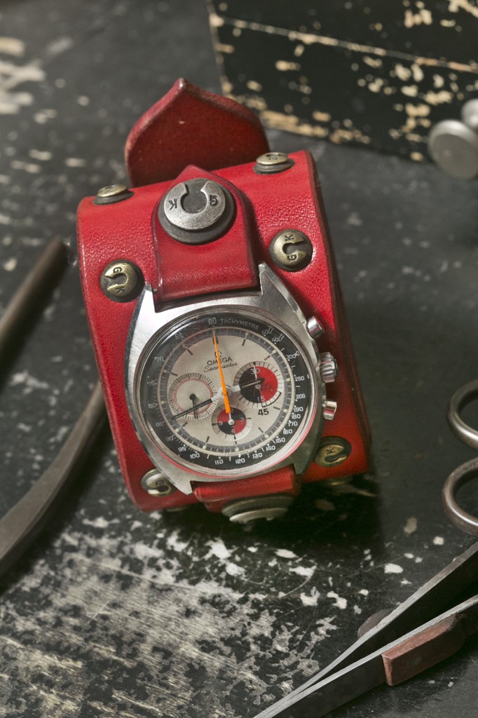 こちらはオメガのシーマスターをベースに、文字盤の赤色に合わせて赤いレザーとブラスでカスタマイズ。オーダーも可能。