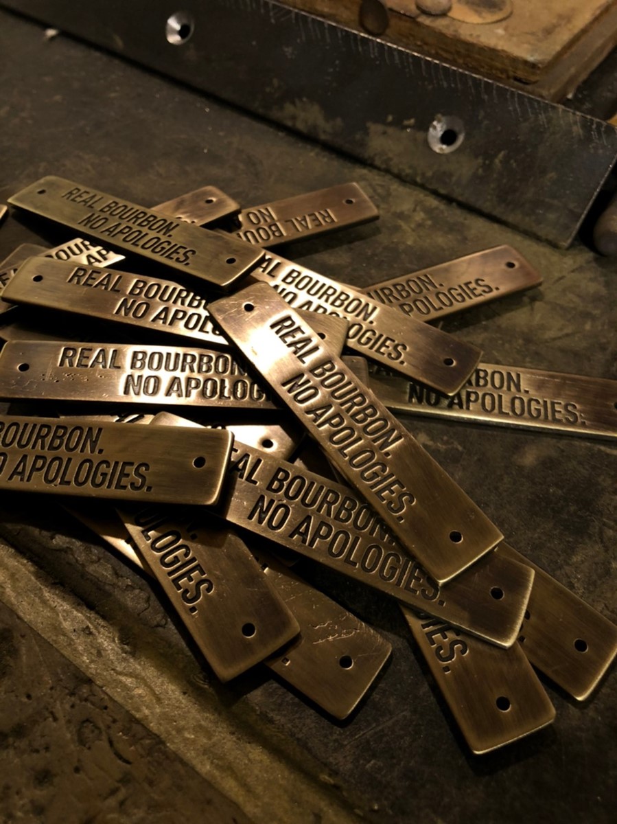 ディスプレイ什器の上段ボックスにデザインされる真鍮プレート。まず研磨→腐食(エイジング)→仕上げ(磨き)という手間のかかる工程で、一つ一つ丹念に仕上げている。