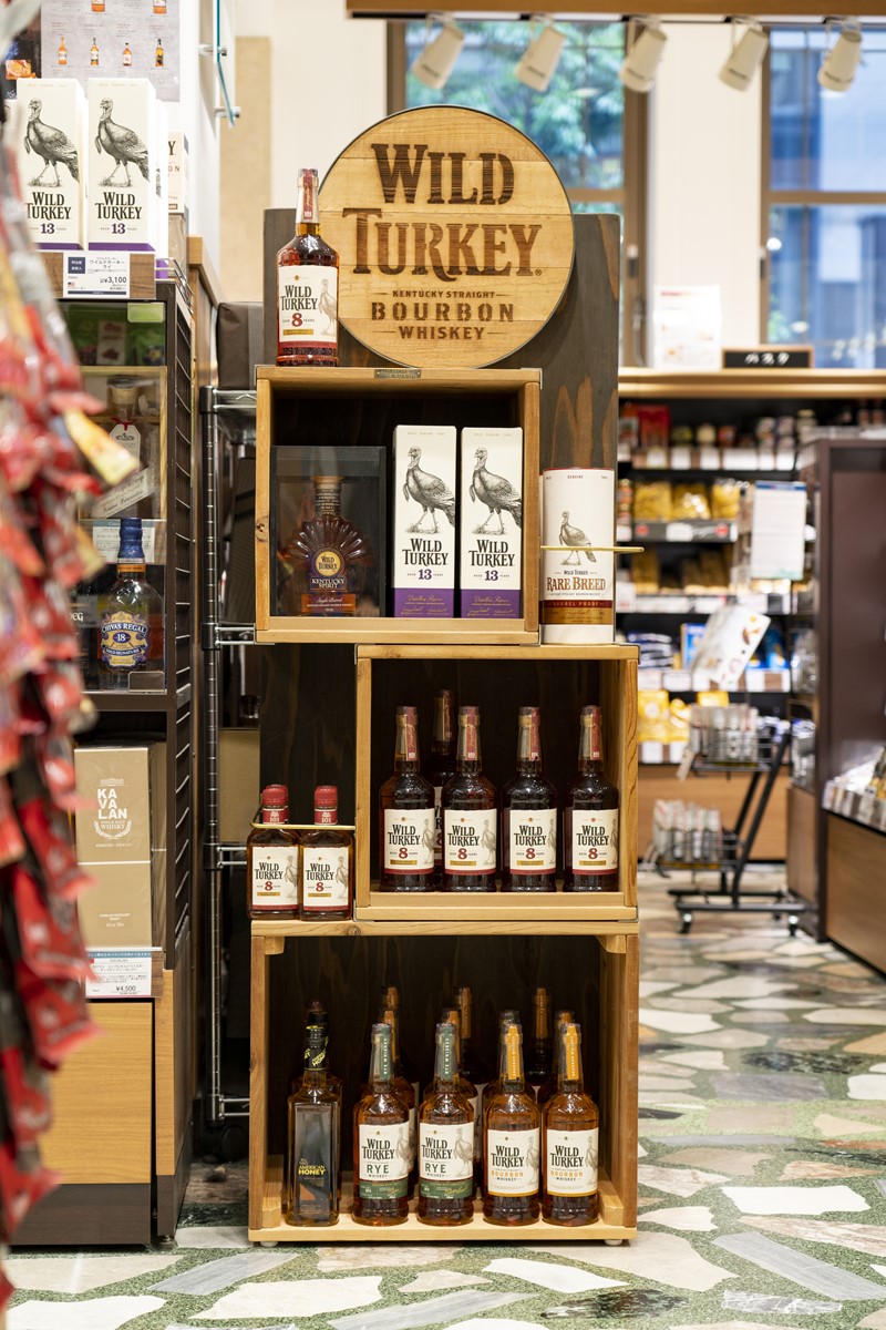 ワイルドターキーが持つクラフト感をイメージした、温もりを感じさせる木製ディスプレイ什器。その自慢のラインナップをしっかり飾ることができた。この棚に並んだワイルドターキーをぜひ手に取って欲しい!