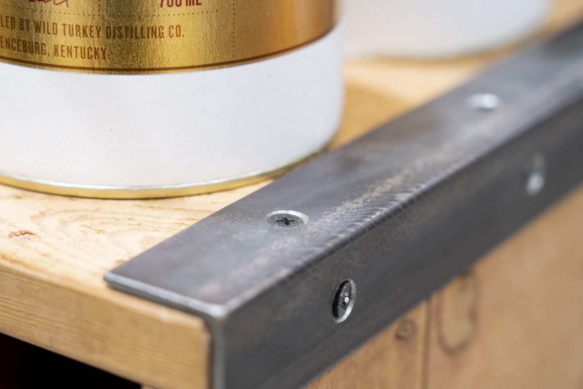 収納ボックスはアングル金具で補強。経年によって金属に味が出てくるので、よりワイルドターキーが持つタフなイメージに近づくはずだ。