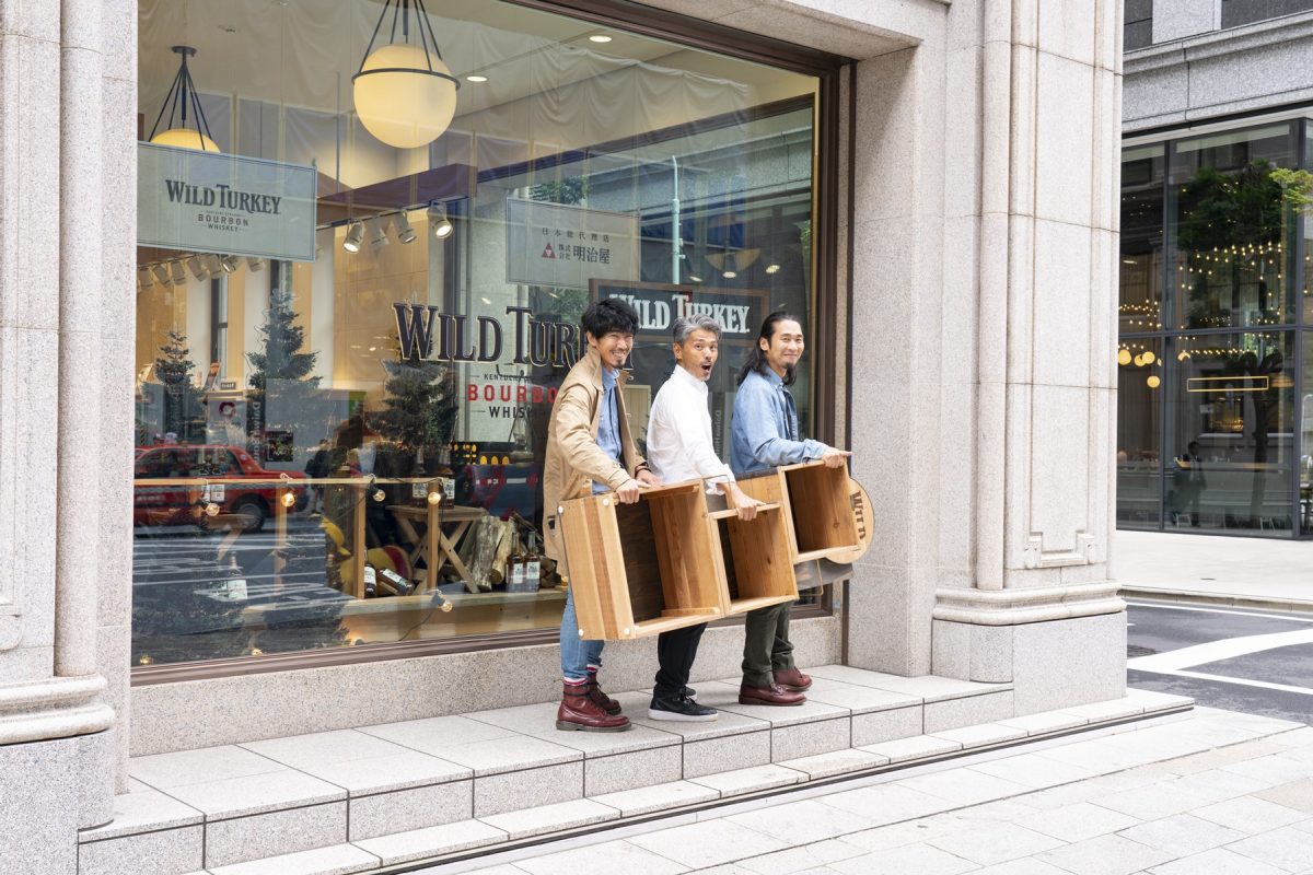 というわけで、さっそく専用ディスプレイ什器を抱えた3人は、開店前の明治屋さんの店内へと足を運ぶ。取り扱っているワイルドターキーの商品をお借りして、什器の中に飾っていく。店内で果たしてどう見えるのか、ちょっとドキドキ。