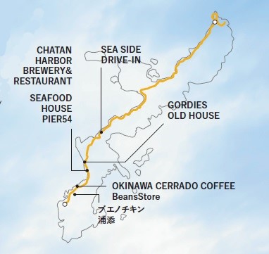 鹿児島市から那覇市へ至る国道。沖縄の西海岸沿いを南北に貫いており、国道沿いには美しい海と森、そしてアメリカ文化が点在する沖縄のメインストリート