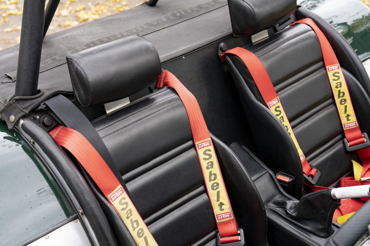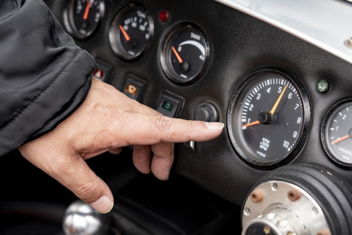 フォーミュラーマシンのような細長いコクピットは、体を滑らせながら乗り込まなければならない。現状は純正のレザーシートだが、辻田氏はナチュラルタンレザーでシートを張り替える予定。