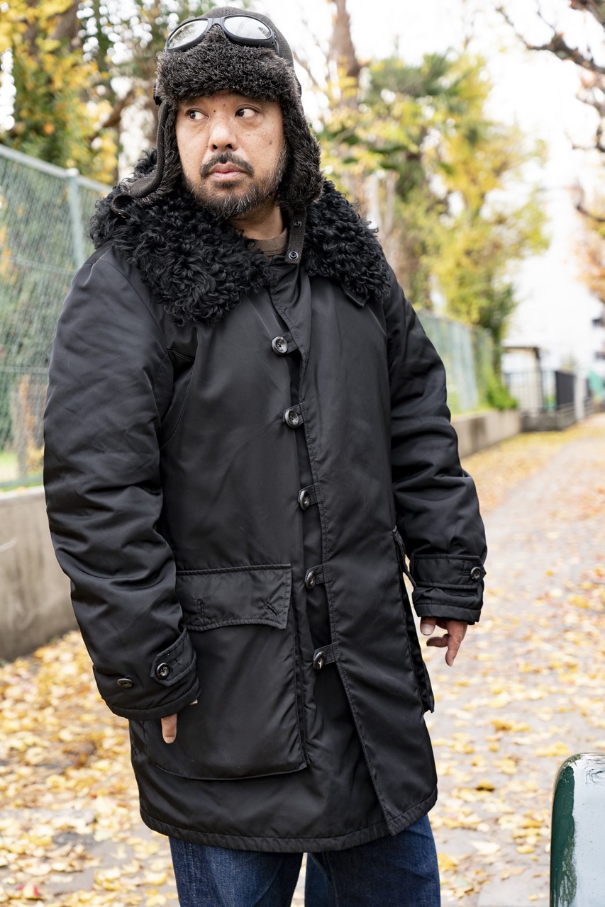 フルカウントのボアコートは、WW2時代のスウェーデン軍のボアコートがモチーフ。ライニングにはプリマロフトを採用し重厚感のあるデザインと現代の機能性を両立させる。二重構造であるビーチクロスとフェイクファーを組み合わせた保温性抜群の、ブラウンズビーチのフライトキャップはオープンカーなので顔回りの防寒対策は欠かせないのだ。