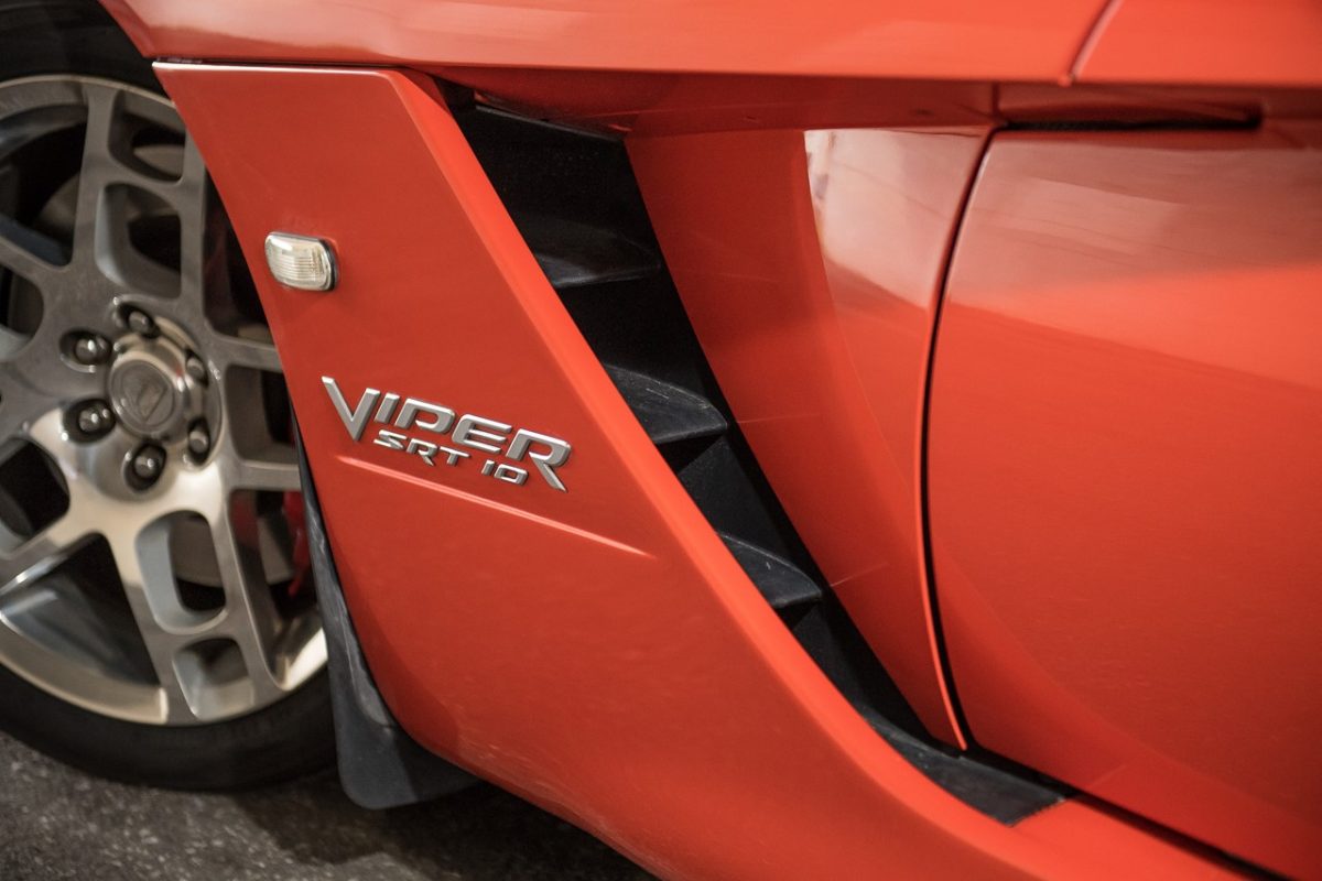 サイドにあしらわれた”VIPER SRT 10″のロゴ。その奥にはスーパーカーならでは仕様であるフロントサイドダクトが。これを見るといかに巨大なエンジンを積んでいるのかがわかる。