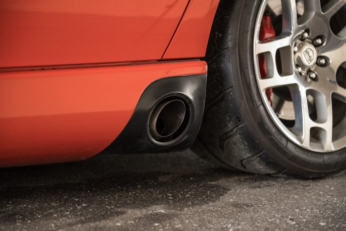 ダッジのバイパーならではの車体の特徴で、多くの人がこれしかないと答えるほど代名詞となっているサイド出しマフラー。出口は真横に見えても、パイプは30°で内部に付いている。