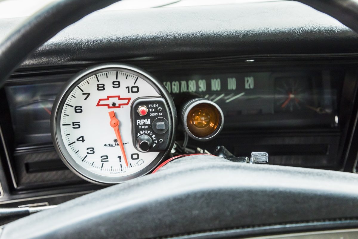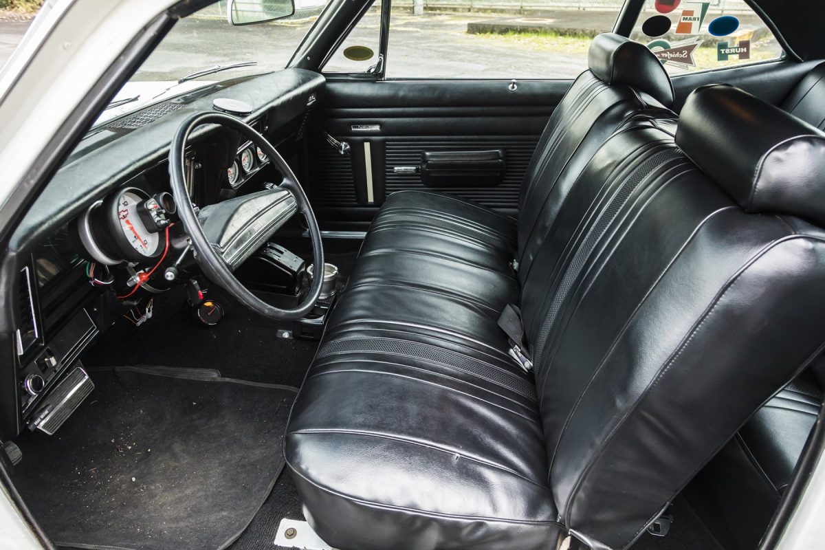 これほどのドラッグレーサーながら、シートはベンチのままで、ステアリングすらノーマル。実はベースの程度が非常に良いことが判る。コラムにマウントしたタコメーターが逆に目立つ。
