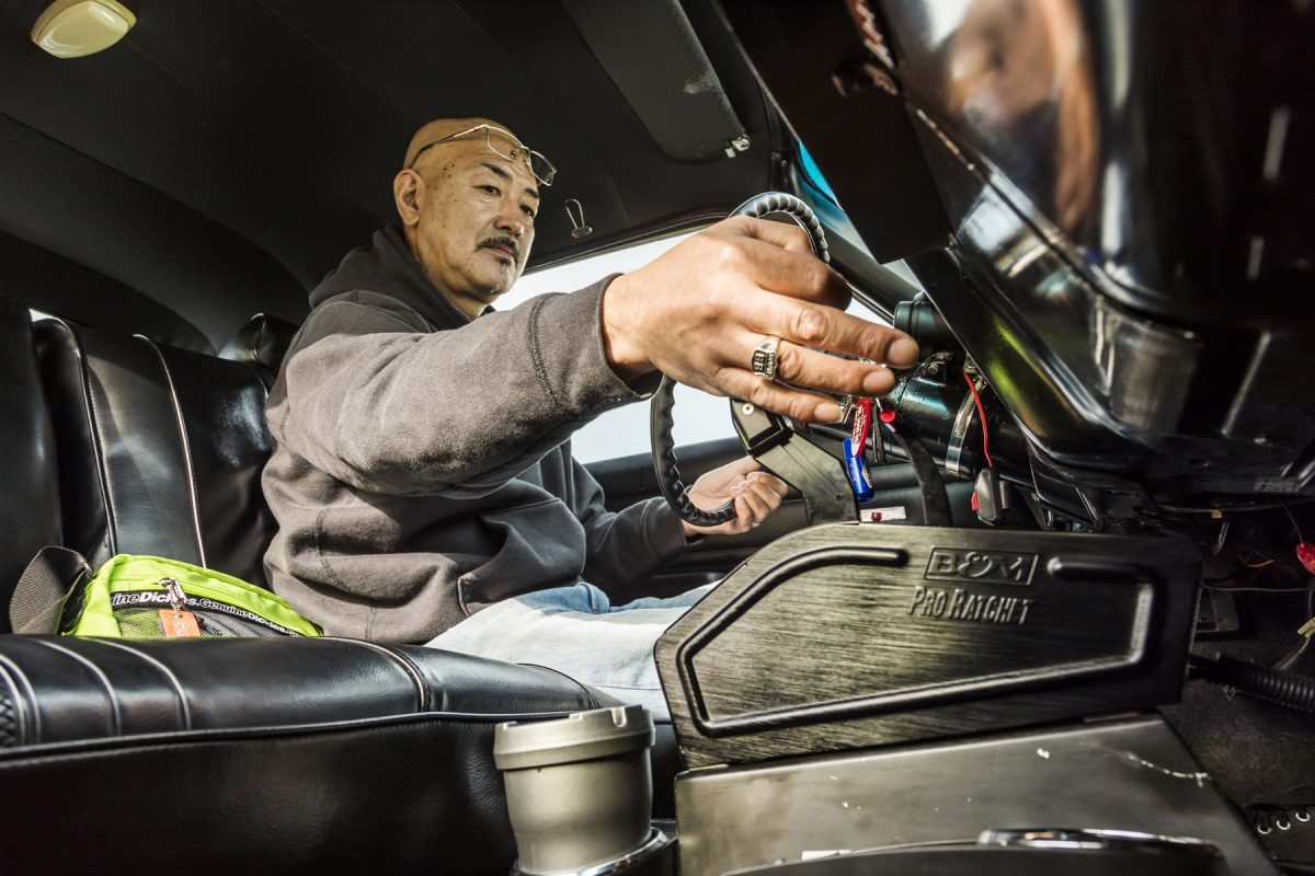 本来コラムシフトだが、フロアにレース用のラチェットシフターを設置。操作方法が特殊だが、街乗りでも違和感なく使いこなす。「慣れちゃえば、全然イケますよ!」