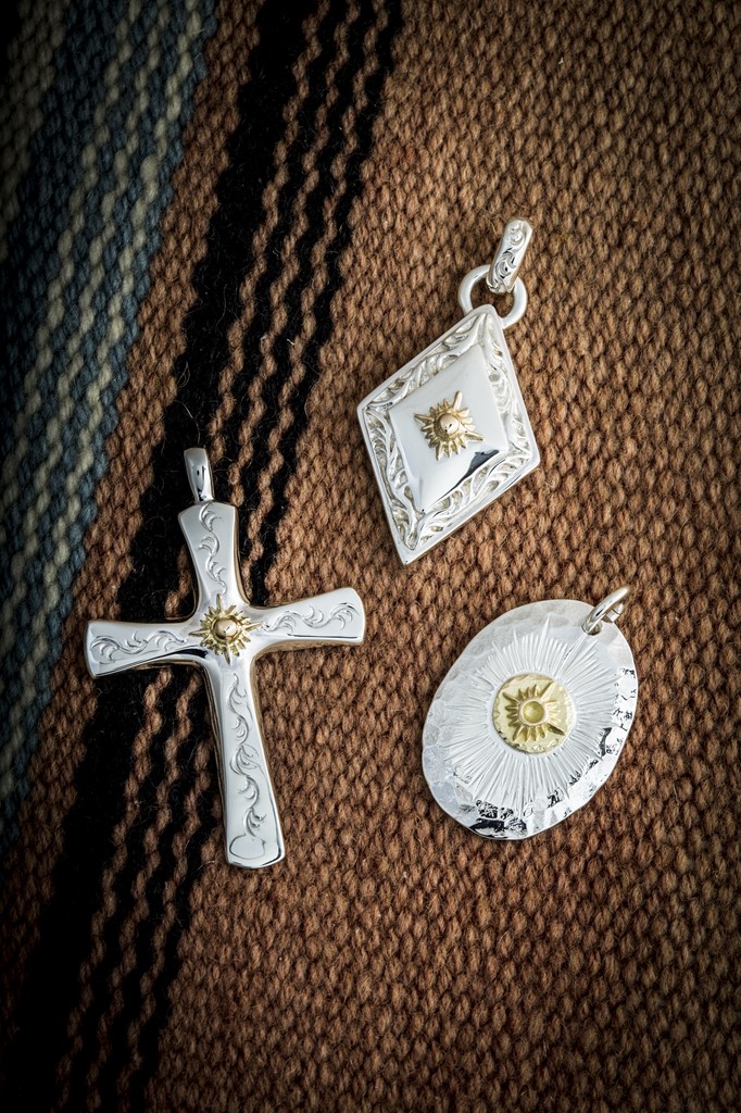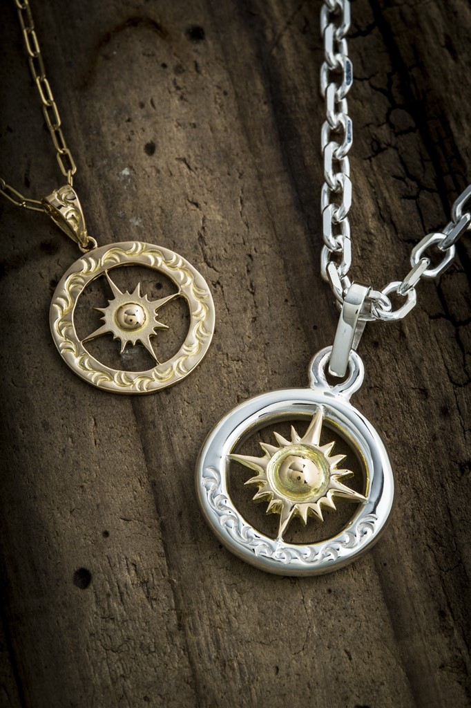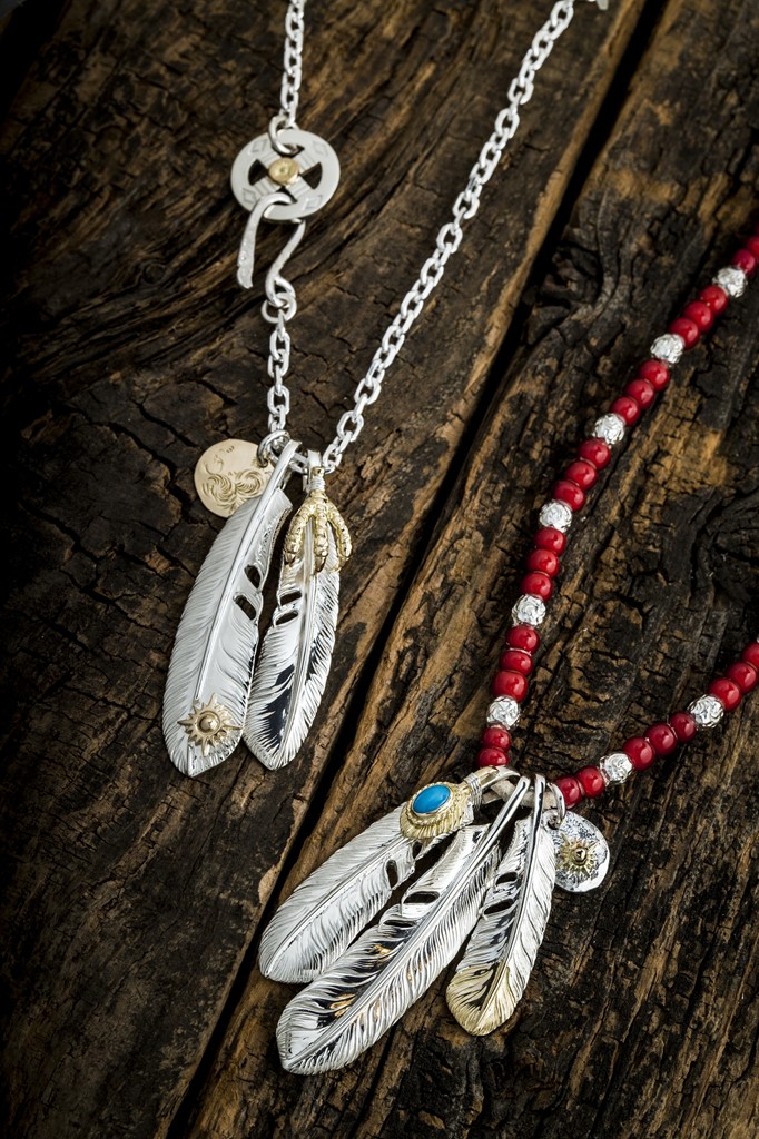 「ARIZONA FREEDOM」の定番であり、その繊細に彫られた羽の美しさから多くのファンを惹きつけているフェザーモチーフ。太陽の神に一番近づくことができる神聖な動物として崇められてきたイーグル。特別なスピリットを持つイーグルは「力強さや名誉」の象徴。またその羽も「勇気や幸運をもたらす」との言い伝えから、精霊と繋がる為の神具として重宝されてきた。そのフェザーに、太陽をあしらったネックレスがこちら。エネルギーの象徴である太陽が添えられることで、よりパワーを感じるデザインとなっている。(左)¥198,180、(右)¥228,712