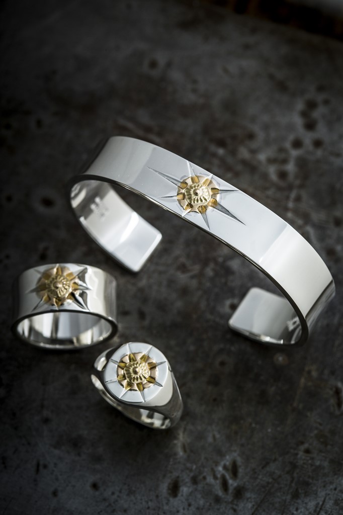 こちらは同じ太陽をモチーフにしたデザインのバングルとリング。男女問わず、いつの時代もファッションアイテムとして愛されてきたリングは、定番アクセサリーだからこそ作り込みの高さが際立つ。シンプルでありながらも卓越した技術が光るデザインはコンビで使いたいところだ。(バングル)¥32,450、(リング上)¥24,750、(リング下)¥22,770