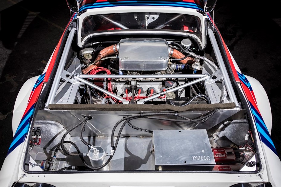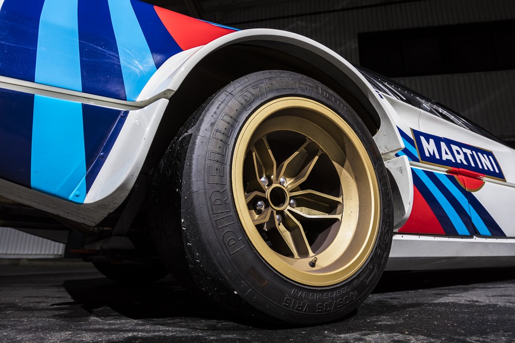 ホイールはランチア・ストラトスのラリーカーと同じマービック製マグホイールを忠実にアルミ製で再現したレプリカ。フレアフェンダーに収まるリアタイヤは305/35-15とかなりワイド。