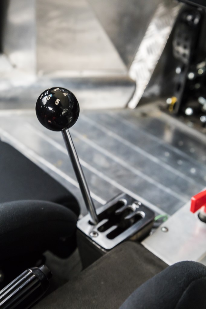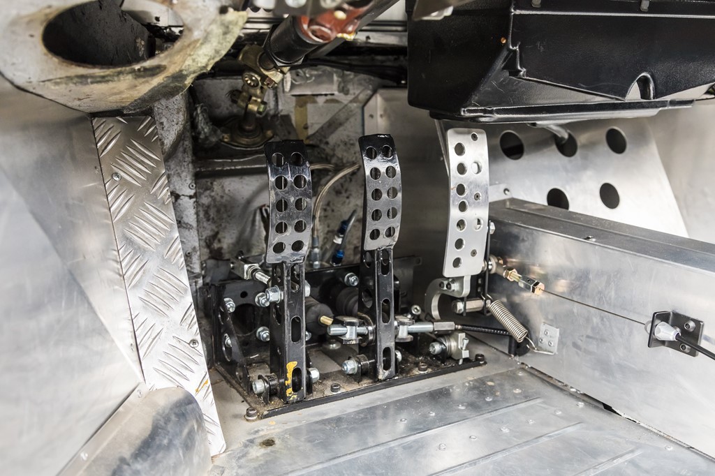 シンプルな平面のダッシュに必要なスイッチや計器類が並ぶラリーカーらしいダッシュ周り。アルミ製のフロアに設置されるのは、通常の吊り下げ式ではなく、フロアを支点としたオルガン式のペダル。