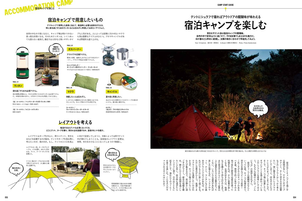 第2特集では「キャンプの基本」。ビギナー・キャンパーにとっての最初の難関、「タープ張り」「テント張り」「火起こし」の3つを徹底解説。またタープ、テント、BBQグリルのカタログも掲載。初心者はもちろん、普段からアウトドアに親しんでいる方ももう一度確認しよう!