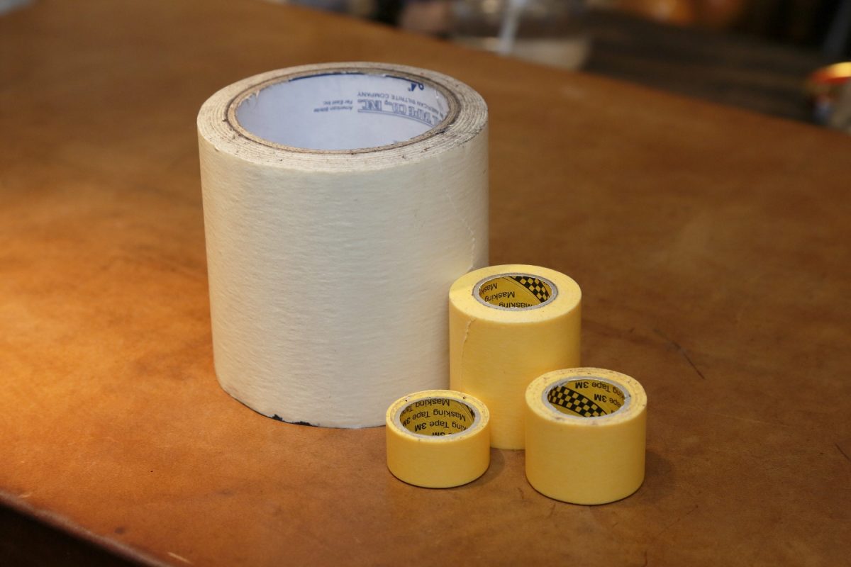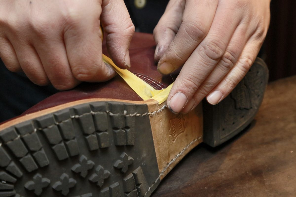 ミッドソールがあるコバ部分、染色以外の箇所にマスキングテープを丁寧に貼っていく。