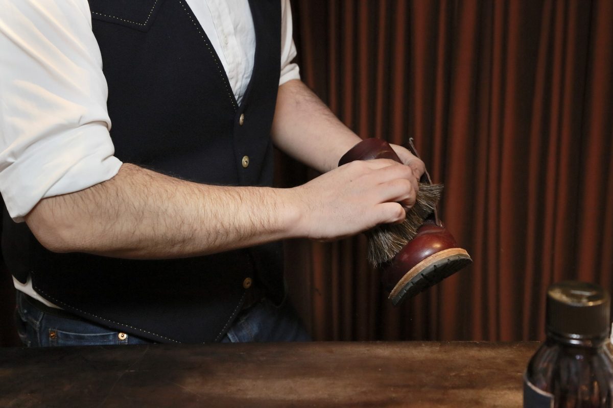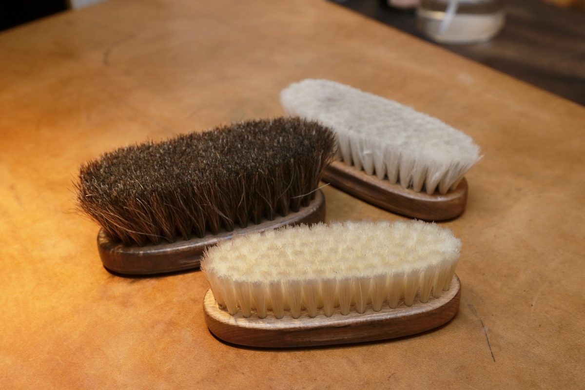 色を整え、革にしなやかさを戻すため乳化クリームを入れ、仕上げのブラッシング。