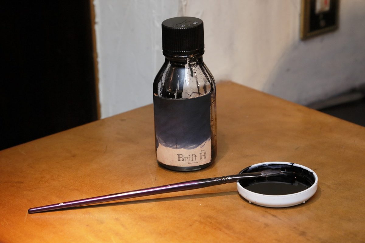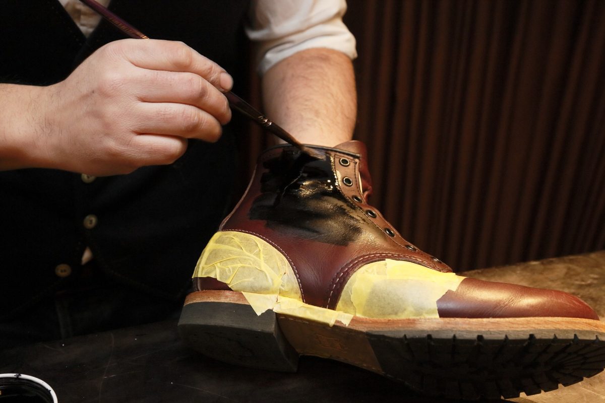 染色用の筆を使用し、染料を浸透させていく。特に履き込んだシワなどあれば入念に。