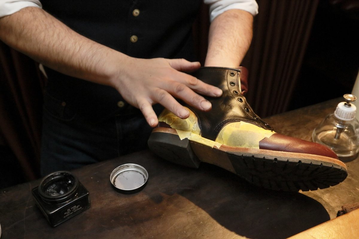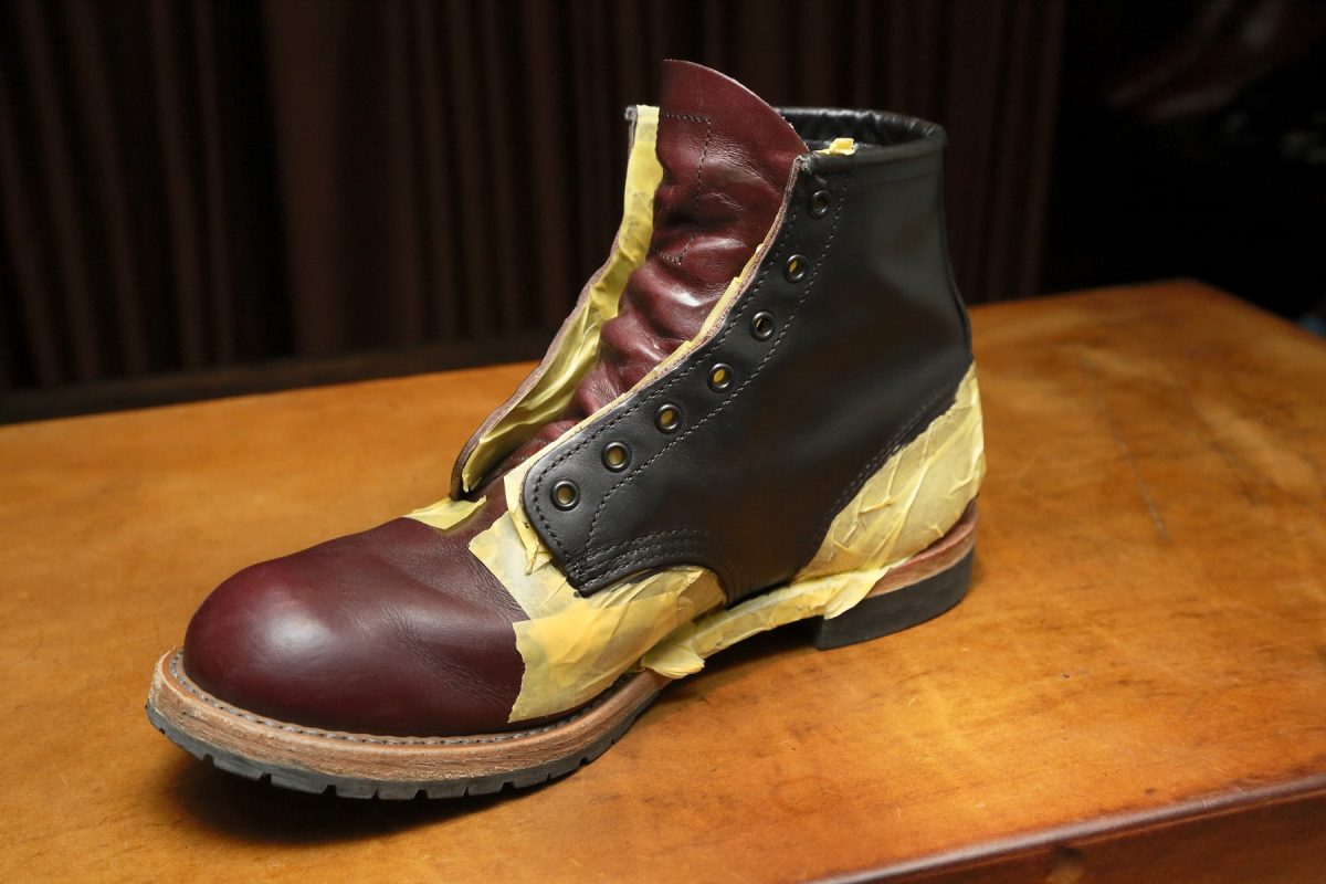 アッパーの羽根部分のみをブラックに染め、ツートーンを希望したブーツ。ブラウンとブラックの相性もよくサドルシューズのようなデザインへと生まれ変わった。靴の磨きも込みで1万8700円~※顔料除去+5500円。