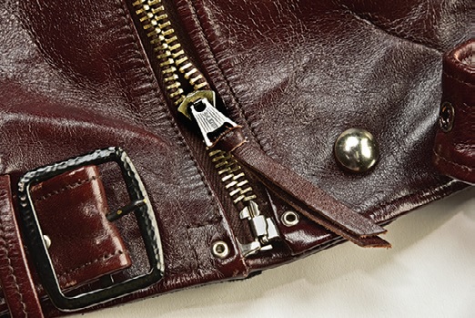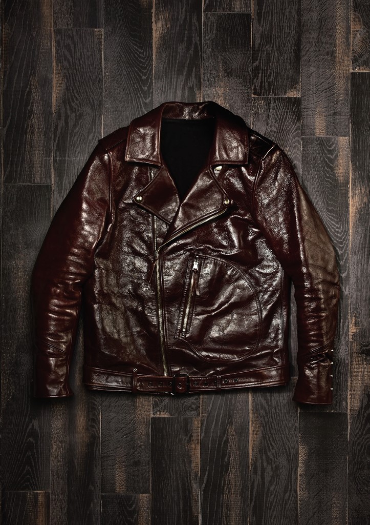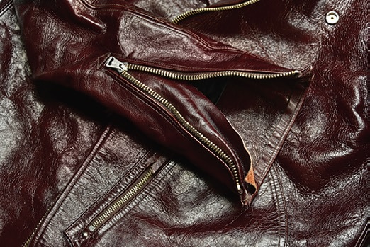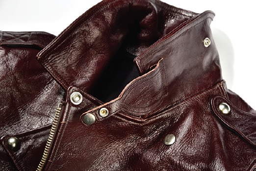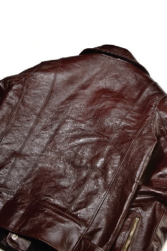 革ジャン界の伝説と呼ばれる’30sの名作をモチーフに、ディテールは精緻にトレースしながらも、パターンを見直し、美しいシルエットを実現している。着てみると、すごくすっきり見えるのだ。で、気になる革質はというと、1.5㎜厚の渋鞣し・アニリン仕上げの茶芯の馬革で、迫力あるシボ感が楽しめ、皺もダイナミックに入る。