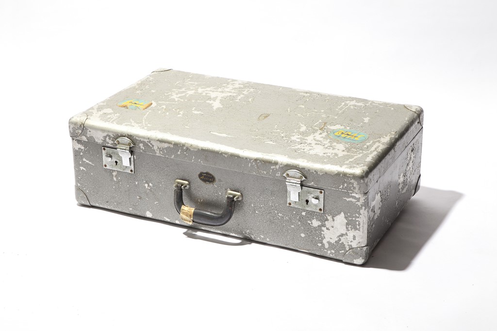 ヴァルカナイズド・ファイバー製で深い藍色をした、’50年代当時のスタンダードな見た目。しかし、強度を高めるために開発された、独特な形(H型)のオリジナル蝶番を使用しており、お値段は3万6000円と少しお高め! [W690×H180×D440㎜]