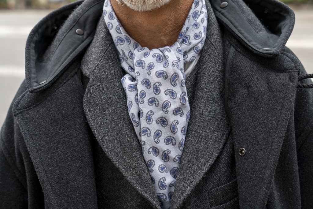 トゥータルのバンダナ柄のスカーフでVゾーンを上品にアレンジ。ダッフルコートなどの厚手のアウター同士をレイヤードでも重苦しくならない印象を演出している。