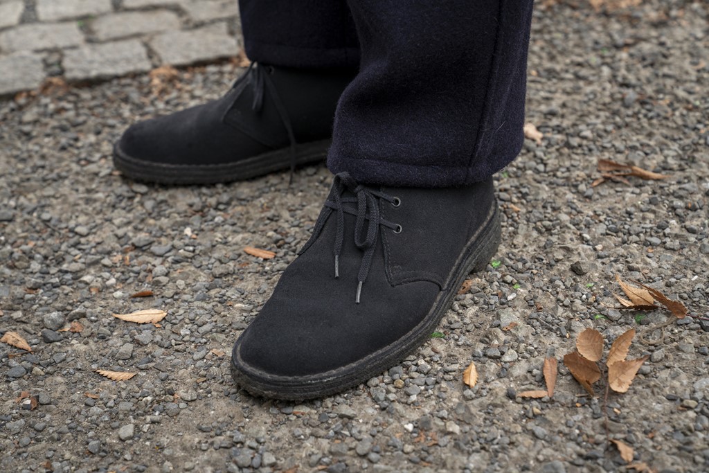 ドライブの時の足元はラバーソールのシューズが基本だという岡田さん。定番中の定番であるクラークスのデザートブーツも着こなしのセンスひとつでここまで新鮮に映る。