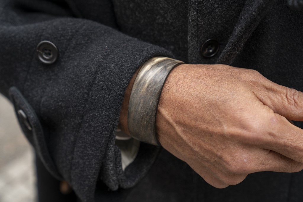 ウィーンの直営店とグローブスペックスのみで購入できるハートマンのバングルを着用。シンプルで合わせやすいデザインに加え、水牛の角を使用した独特の質感がポイント。