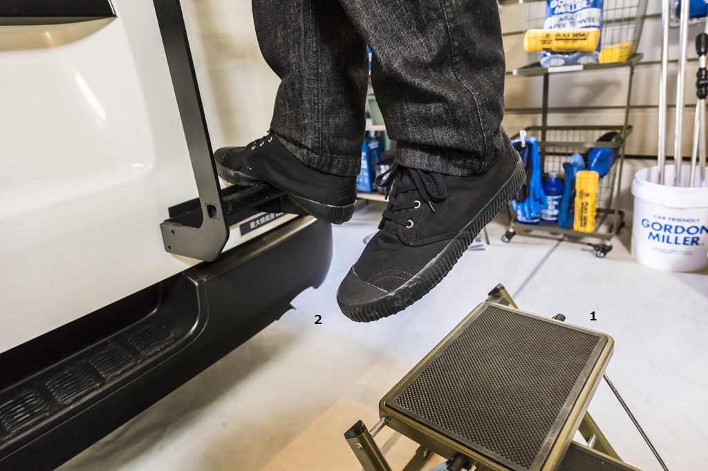 高い所のものを降ろすときや、ルーフキャリアに荷物を積むのにガレージ内に一脚あると便利なステップラダー。またラダーの上り下り時やガレージ内での作業中では歩きやすくてしなやかなスニーカーが便利。