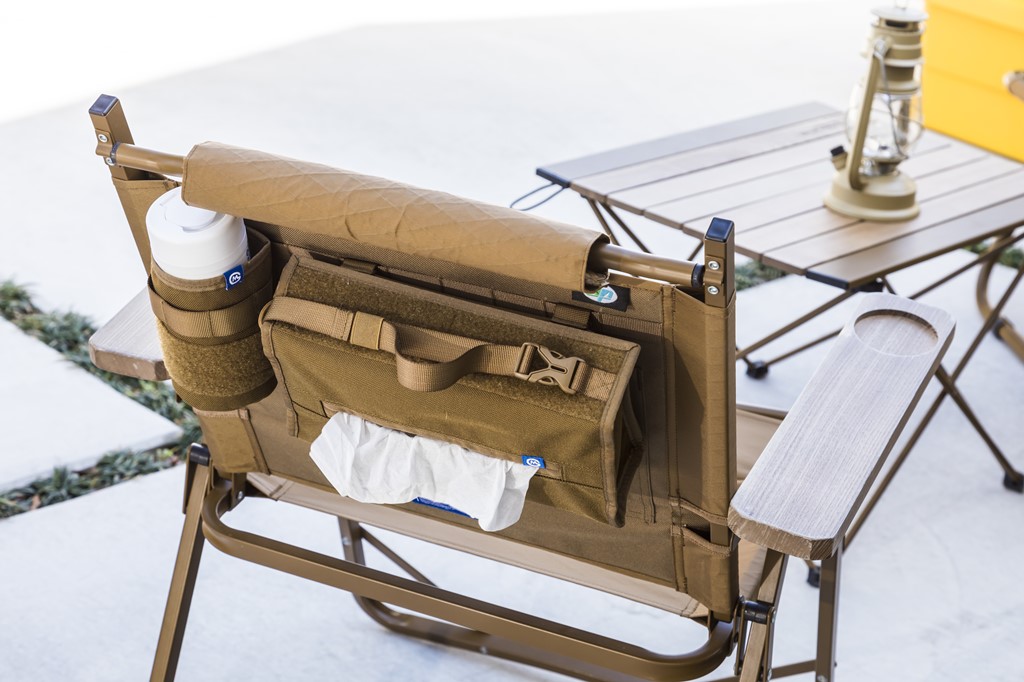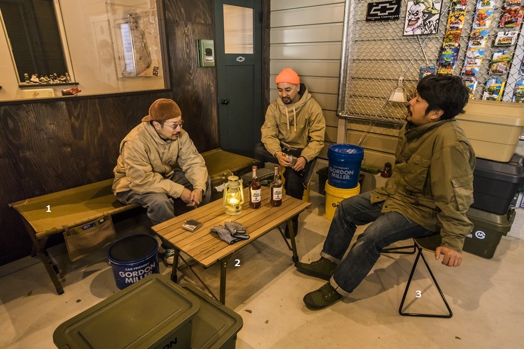折り畳み可能なテーブルやチェアは、落ち着いた色味が多く、ガレージに友達が遊びにきた時に便利。もちろんこのままクルマに積み込めば、アウトドアでも使える便利アイテムだ。